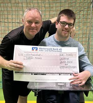 Die Alten Herren von Leuterod-Ötzingen überreichten am 26. März 2025 unserem Edelfan Derek Manns eine Spende in Höhe von 1.000,00 €. Die Spende wurde anlässlich des Spendenaufrufes von Thorsten Götsch im Verbandsgemeindeblatt gestartet.