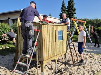 Wir haben uns riesig über den positiven Bescheid der Förderung in Höhe von 2000 Euro gefreut. Der noch fehlende Betrag wurde durch unseren Verein finanziert. Nach der Lieferung wurde mit den Fundamentarbeiten begonnen und der Boden mit den Füßen einbetoniert. Nachdem das Fundament ausgehärtet war, hat ein „Bautrupp“ den Aufbau des Spielhauses fertig gestellt.