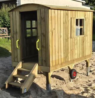 Ein Spielhaus in Bauwagenform mit 2 Sitzbänken war unser Favorit.