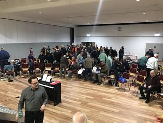 Beinahe Punkt 20:00 Uhr öffneten wir nach der eigentlichen Frohsinn-Probe, begonnen wurde dort unter anderem mit dem neuen Stück "Westerland" (Die Ärzte), die Türen zum Foyer des Bürgerhauses und wollten unseren Augen kaum trauen: zahlreiche Gäste aus unzähligen unterschiedlichen Ortschaften und aller Altersgruppen waren gekommen, um unverbindlich in das Projekt reinzuschnuppern. Ein derartiger Andrang kam zur Freude aller Frohsinn'ler, trotz positiver Resonanz und zahlreicher Voranmeldungen im Vorfeld, dennoch überraschend. Ein Auftakt nach Maß!