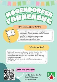 In diesem Jahr freuen wir uns über viele Gruppen, kleine und große, jung und alt, Nachbarn, Freunde, Vereine, die mit einer selbst gestalteten Fahne, passend zum Motto der Gruppe, zur Kirmes, zu Mogendorf o.ä. am Zug teilnehmen. Viele erinnern sich ganz bestimmt an den Kirmesumzug im Jahr 2011: viele Gruppen mit selbst gestalteten Bollerwagen (oder auch größeren), die bereits im Vorfeld beim Sammeln von Ideen und Herrichten der Wagen und auch während des Zuges großen Spaß hatten. Lasst uns hier anknüpfen, trefft euch, seid kreativ und fiebert dem Kirmessamstag entgegen. Die „schönste“ Fahne wird prämiert und die Sieger am Kirmessonntag geehrt.