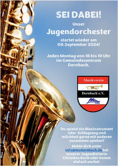 Am 09. September ist es so weit. Nach längerer Coronapause startet unser Jugendorchester endlich wieder! Bist du acht Jahre oder älter und spielst seit über einem Jahr ein Blasinstrument oder Schlagzeug? Hast du Spaß daran, in einer Gruppe mit netten Leuten zu Musik zu machen? Dann melde dich unter info@mvdernbach.de oder schau einfach vorbei! Wir freuen uns auf dich!