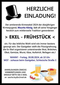 Traditionen sind dazu da, um bewahrt zu werden. Jede Tradition hat einen, ihren, Anfang. Das Ekelfrühstück feierte in den frühen 2020er Jahren in kleiner Runde seine Premiere und wuchs seitdem beständig zu einem festen Highlight im jährlichen Kirmeskalender heran. Jedes Jahr stoßen mehr ehemalige Kirmesekel hinzu und während im vergangenen Jahr 2023 den jüngsten und den ältesten Teilnehmer solide rund 70 Jahre Alter trennten, war dennoch zu keinem Zeitpunkt spür- oder sichtbar, dass dort bei Kaffee, Bier, "klaren Verhältnissen" und einem üppigen Frühstücksmahl zu Brunchzeiten 4-5 unterschiedliche Generationen ehemaliger Zylinderträger gemeinsam an einem Tisch saßen und Anekdoten aus ihren Zeiten als Kirmesekel teilten. Auch in diesem Jahr freuen wir uns sehr über die Bereitschaft des amtierenden Kirmesekels, Mauritz aus dem Hause König, die Schar seiner Vorgänger in die eigenen 4 Wände zum Schwatzen, Schmausen (und Süffeln) einzuladen. Wer einmal Kirmesekel in Wirges war und teilnehmen möchte, kündigt und meldet sich bitte via E-Mail an sascha.ley@o2mail.de an oder lässt über Dritte übermitteln, dass er sicher hinzustößt. Alle weiteren Infos erfolgen anschließend nach Kontaktaufnahme. Wer ehemalige Wirgeser Kirmesekel kennt, darf jene gern auf diese Einladung hinweisen. Letztes Jahr saß man mit satten 13 Altekeln und dem aktiven Amtsinhaber bei Tisch - der Senior des Tages ein beeindruckendes 1934er-Baujahr. Gerne würden wir diese tolle Beteiligung wiederholen oder gar toppen. Also: Ruck geben, ankündigen, teilnehmen!
