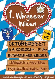 Anfang Oktober wird es im Wirgeser Bürgerhaus feuchtfröhlich: unsere Kirmesgesellschaft lädt erstmals zum traditionellen Oktoberfest ein! Zünftige Blasmusik & Après-Ski-Stimmungshits, alpenländische Gastlichkeit und bayerische Spezialitäten, wohlschmeckendes Festbier und gut gelaunte Gäste, Gastgeberinnen und Gastgeber! Am 05.10.2024 um 19:00 Uhr öffnen sich die Türen des Bürgerhauses für euch. Unsere Gäste erwartet eine reichhaltige Auswahl an Getränken (inkl. Aperol-Bar), festliche Wiesn-Stimmung mit dem Musikverein Hundsangen e.V. und ihrer Party-Kombo, süddeutsche Kulinarik und Vieles mehr! Zwei Happy-Hour's mit Getränke-Specials um 19 Uhr & 0 Uhr unterstützen das feierliche Einheizen! Lasst euch überraschen und feiert mit uns die Premiere der 1. Wirgeser Wiesn! Wichtige Informationen zur Festivität: EINLASS ab 18 Jahren - Kontrolle am Eingang! Die Veranstaltung beginnt um 19 Uhr und endet um 1:00 Uhr. Das Erscheinen in Trachtenkleidung ist ausdrücklich erwünscht. Wer passend gekleidet kommt und die Karten im VVK erwirbt, wird am Abend mit einem Begrüßungsschnaps belohnt! Vorverkauf Ab sofort. Eine Möglichkeit des Ticketerwerbs vor Ort ist am Mittwoch, dem 21. August 2024 abends ab 18 Uhr im Funktionsgebäude in Wirges (am Stadion), gegeben. Eintrittskarten sind zum VVK-Preis in Höhe von 12€ (AK 15€) via E-Mail unter vorstand@kg-wirges.de oder direkt über unsere Vereinsmitglieder zu beziehen. Verbindliche Tischreservierungen können für Gruppen von 4-12 Personen vorgenommen werden. Wer einen kompletten Tisch (12 Personen) reserviert erhält rabattierte Eintrittspreise. Wir freuen uns wie Bolle auf die Ausrichtung dieses Events und zählen auf eure Unterstützung sowie zahlreiche Besucherinnen und Besucher! (die ersten 5 vollen Tische sind bereits reserviert)
