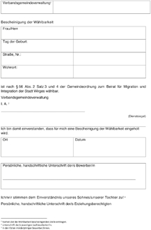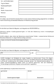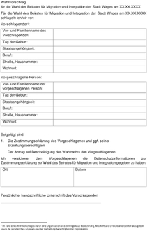(2) Jeder Wahlberechtigte kann einen Wahlvorschlag mit einem oder mehreren Bewerbern bis zur anderthalbfachen Zahl der zu wählenden Mitglieder des Beirates für Migration und Integration nach dem Muster der Anlage 1 einreichen; er kann sich auch selbst vorschlagen. In diesem Rahmen können auch im Wahlgebiet ansässige Vereine, Verbände oder sonstige Organisationen und politische Parteien und Wählergruppen Wahlvorschläge einreichen. Es sind nur Wahlvorschläge mit schriftlicher Zustimmung des Bewerbers nach dem Muster der Anlagen 2, 2a und 2b, gültig. Der Wahlvorschlag ist außerdem vom Vorschlagenden zu unterzeichnen. Im Wahlvorschlag sind der Vorschlagende und der Bewerber (Name, Vorname und Anschrift) eindeutig zu bezeichnen und um weitere Merkmale zu ergänzen, sofern diese zur Identifizierung erforderlich sind.