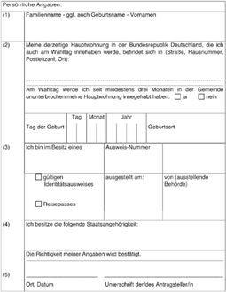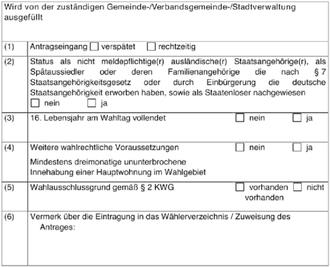 (3) Der Wahlleiter veranlasst für das Wahlgebiet die Erstellung eines Verzeichnisses der Wahlberechtigten (Wählerverzeichnis). Auf Antrag sind in das Wählerverzeichnis, alle Einwohner, die die deutsche Staatsangehörigkeit erworben haben