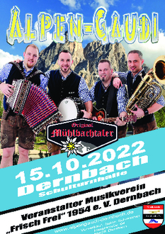 Am 15.10.2022 startet die Dernbacher Alpen-Gaudi in ihre sechste Runde! Nach zwei Jahren Coronapause freut sich der Musikverein Dernbach wieder auf viele Gäste in der Turnhalle in Dernbach. Einlass ist um 18.30 Uhr, Beginn 19.00 Uhr.