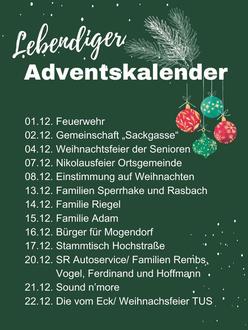 Anlässlich der Kirmes haben sich schon viele Ausrichter für den diesjährigen Lebendigen Adventskalender in Mogendorf gefunden. Herzlichen Dank dafür!