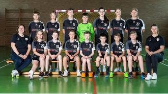 Das Foto zeigt die D-Jugend-Handballer/innen der JSG Ahrbach/Bannberscheid mit Trainerin Julia Behne (vorne links) und Betreuerin Lena Kraus (vorne rechts).