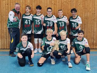 BUZ: Die U 14 der Westerwald Volleys in Asbach, hinten von links nach rechts: Trainer Erwin Hausen, Danilo Roock, Diar Saliu, Felix Geiling, Sam Wenzel, Civan Özduygu. Vorne von links nach rechts: Pepe Erlewein, Fabian Hahn mit Mentalcoach Willi, Carlo Frey, Kaan Altun. Auf dem Bild fehlt Leon Luma, nicht dabei sein konnten Maik Deines und Co-Trainer Pablo Ferdinand.