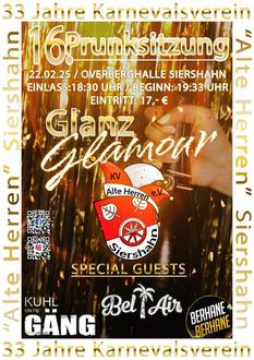 Unter dem Motto „Glanz & Glamour“ lädt der Karnevalsverein Siershahn zur 16. Prunksitzung am 22. Februar 2025 ab 18.30 Uhr in die Overberghalle ein. Neben dem bekannten Redner „Berhane Berhane“ konnten wir zu unserem Jubiläum zwei kölsche Bands verpflichten. Neben „Kuhl un de Gäng“ welche die Halle zum Beben bringen werden, geben sich ebenfalls „Bel Air“ nach 2023 ein weiteres Mal die Ehre bei uns zu Gast zu sein. Der Termin für den Kartenvorverkauf folgt in Kürze.