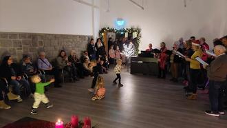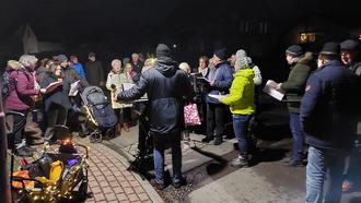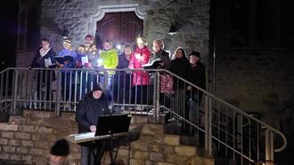 Bei einem der Jahreszeit entsprechendem Wetter und unter musikalischer Begleitung durch den Dirigenten Dieter Wick mittels eines auf einem Bollerwagen befestigten Keyboards ging es auf einem Rundweg mit insgesamt 7 Stationen vom Spielplatz an der Aubachhalle zum Brunnen und weiter über die Nord-, Jahn-, Süd- und Kirchstraße zum Abschluss an unserer Kirche. Gegen die Kälte wurden heiße Getränke auf einem zweiten Bollerwagen mitgeführt, welche auch halfen, die Stimmbänder für das Singen der Weihnachtslieder zu ölen. Insgesamt hatten alle Beteiligten großen Spaß und freuen sich schon auf eine Wiederholung im Advent 2025.