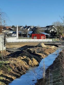 Nach der Schnee und Eisperiode zum Jahresbeginn hat die Firma Triesch nun die Arbeiten in unserer Ortsmitte wieder aufgenommen. Aktuell wird an dem neuen Bachbett gearbeitet. In der kommenden Woche werden hier die Wasserbausteine eingebaut, und die Ufer modelliert. Die Firma geht davon aus dass in der zweiten Februarhälfte das neue Bachbett geflutet werden kann. In der Folge werden die Arbeiten auf der Kirmesplatzseite mit der Herstellung der Zufahrt, der Wegeherstellung, sowie der Vorbereitung für die neuen Brückenfundamente fortgeführt. Zeitgleich werden voraussichtlich auch die Bushaltestelle und der Parkplatz zurückgebaut, so dass der Busverkehr voraussichtlich ab dem 01.03.2024 vollständig über die beiden Bushaltestellen in der Bahnhofstraße abgewickelt wird. Leider kann die alte Brücke am Kirmesplatz nicht wie ursprünglich geplant provisorisch über die beiden Bachläufe verlegt werden. Daher müssen Fußgänger bis zur Fertigstellung der neuen Brücke leider den Umweg über die Bahnhofstraße in Kauf nehmen.