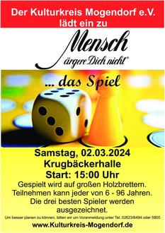 Der Kulturkreis Mogendorf e.V. lädt ein zum diesjährigen „Mensch ärgere Dich nicht“ Turnier. Am 02.03.24 treffen wir uns um 15:00 Uhr in der Krugbäckerhalle im Altentag. Der Eintritt ist frei. Am Ende werden die ersten drei Plätze einen kleinen Gewinn erhalten. Wir freuen uns auf einen unterhaltsamen Nachmittag mit Euch.
