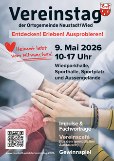 Am Samstag, den 09.05.2026, veranstaltet die Ortsgemeinde Neustadt von 10:00 Uhr bis 17:00 Uhr erstmals einen Vereinstag rund um die Wiedparkhalle. Unter dem Motto „Heimat lebt vom Mitmachen“ soll dieser Tag die Vielfalt und das Engagement unserer örtlichen Vereine sichtbar machen und gleichzeitig eine Plattform für Begegnung, Austausch und Mitmachen bieten.