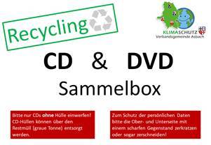 Die Verbandsgemeinde Asbach hat für die Entsorgung von CDs eine CD-Sammelbox und für Handys eine Handy-Sammelbox aufgestellt und wird die gesammelten CDs und Handys regelmäßig den regionalen Rücknahmesystemen zuführen. Bürgerinnen und Bürger können ausgediente CDs und Handys zu den gewöhnlichen Öffnungszeiten des Rathauses kostenlos abgeben. Wichtig dabei: Wer seine persönlichen Daten schützen möchte, sollte die Ober- und Unterseite der CDs mit einem scharfen Gegenstand zerkratzen oder sogar zerschneiden. Die CD-Hüllen können über den Restmüll (graue Tonne) entsorgt werden. Es dürfen keine in schwerem Maß beschädigte Handys oder bereits aufgeblähte Akkus abgegeben werden. Diese können im Elektrofachmarkt oder auf dem Wertstoffhof abgeben werden.