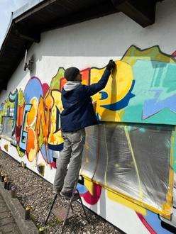 Und so ist jetzt in leuchtenden Farben das Wort Jugendtreff unübersehbar und wirklich eindrucksvoll gestaltetet an der vormals weißen Wand zu lesen.