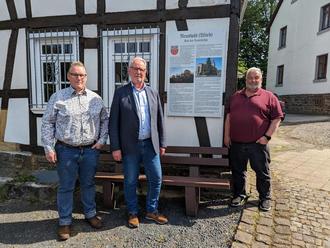 Eine Tafel hängt am Eingang zum Gemeindebüro und die andere am Museum in der Hauptstraße. Der Beigeordnete Christoph Petri, der Museumsleiter Peter Lorscheid und der Ortsbürgermeister freuen sich über die gelungene Darstellung.