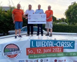 Von Anfang an eine gelungene Sache: Daniel Schröder und Norbert Mietz von dem neu gegründeten Verein ‚Wiedtal-Classic e.V.‘ übergaben beim „Helferfest“ den Scheck an Michael Christ, Bürgermeister der Verbandsgemeinde und Arnold Schücke, Vertreter der Feuerwehr VG Asbach. Auch im nächsten Jahr soll das Mega-Event der Nostalgie wieder starten um Auto-Fans von nah und fern zu begeistern. Neuer Termin zum Eintragen ist der 18. Juni 2023.