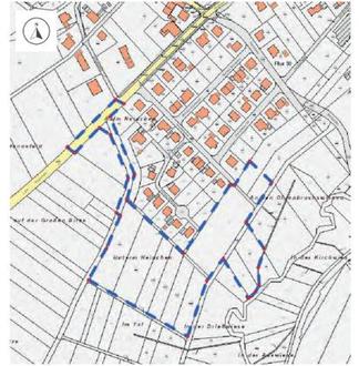 Es sind sämtliche Grundstücke in der Flur 30 der Gemarkung Buchholz betroffen, die im nachfolgenden Übersichtsplan dick blau gestrichelt umrandet sind. (Datengrundlage: Geobasisinformationen der Vermessungs- und Katasterverwaltung Rheinland-Pfalz; Zustimmung v. 15.1.2002).