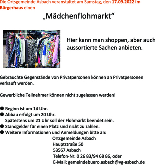 Die Ortsgemeinde Asbach veranstaltet am Samstag, den 17.09.2022 im Bürgerhaus einen