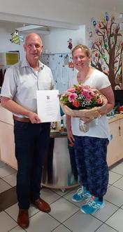 Ortsbürgermeister Buchholz konnte am 14.08.2023 bei einem Besuch in der KiTa zu diesem besonderen Ereignis gratulieren und sich gleichzeitig für die jahrelange Mitarbeit in unserer KiTa und somit im Dienst der Allgemeinheit und insbesondere der Kinder in unserer Ortsgemeinde bedanken.