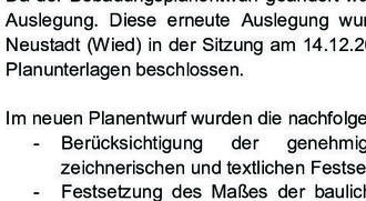 Da der Bebauungsplanentwurf geändert wurde, erfolgt hierzu eine erneute öffentliche Auslegung. Diese erneute Auslegung wurde vom Gemeinderat der Ortsgemeinde Neustadt (Wied) in der Sitzung am 14.12.2023 mit gleichzeitiger Annahme der neuen Planunterlagen beschlossen.