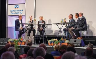 Zuvor gehörte die Bühne vier Ehrenamtlichen: Nathalie Mohr, Paul Salz, Nicole Behrens und Frank Brabender gewährten Einblicke in die Arbeit der sieben Kundenbeiräte der Raiffeisenbank Neustadt. In der von Marcelo Peerenboom moderierten Talkrunde berichteten die Teilnehmer, was sie bereits alles anstoßen konnten. Nathalie Mohr verwies für den Jugendbeirat auf den Aufbau der Social-Media-Kanäle sowie die Finanzbildung an Schulen. Der Beirat Aktiv 65+ hingegen beschäftigt sich nach Angaben von Paul Salz seit Längerem mit der Frage, wie Kunden im Rentenalter Finanzierungswünsche realisieren können. Wie Nicole Behrens erzählte, diskutiert der Firmenkundenbeirat regelmäßig die aktuelle wirtschaftliche Lage und gibt der Bank hilfreiche Hinweise. Und der Regionalbeirat hat ein Konzept entwickelt, um Photovoltaik-Freiflächenanlagen zu installieren, wie Frank Brabender sagte. Konrad Breul zeigte sich als Vorstandsmitglied der Genossenschaftsbank sehr dankbar für das Engagement der Beiratsmitglieder, die er als ganz besondere Unternehmensberater bezeichnete, die wichtige Impulse geben.