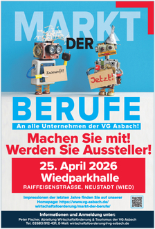 Die Planungen für den „Markt der Berufe 2026“ laufen schon jetzt auf Hochtouren. Etliche Anmeldungen liegen bereits vor, sodass wiederholt ein großes Ereignis seine Schatten voraus wirft. „Aufgrund der positiven Resonanz und der enormen Nachfrage haben wir uns dazu entschieden, auch im nächsten Jahr den „Markt der Berufe“ auszurichten“, berichten Michael Christ, Bürgermeister der Verbandsgemeinde Asbach sowie der Verbandsgemeinde-Wirtschaftsförderer Peter Fischer. „Wie auch schon in den Vorjahren möchte die Verbandsgemeinde Asbach diese Plattform bieten, um die Schüler/innen der Region bei der Berufswahl zu unterstützen und heimischen Unternehmen bei der Suche nach den Fachkräften von Morgen zu helfen“, so Christ und Fischer weiter.