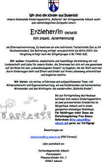 Unsere Kommunale Kindertagesstätte „Bullerbü“ der Ortsgemeinde Asbach sucht zum nächstmöglichen Zeitpunkt eine/n