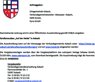 Die Ausschreibung kann auf der Homepage der Verbandsgemeinde Asbach unter https://www.vg- asbach.de/aktuelles/ausschreibungen/ und auf www.bund.de eingesehen werden.