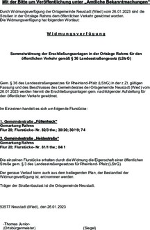 Gem. § 36 des Landesstraßengesetzes für Rheinland-Pfalz (LStrG) in der z.Zt. gültigen Fassung und des Beschlusses des Gemeinderates der Ortsgemeinde Neustadt (Wied) vom 26.01.2023 werden hiermit die Erschließungsanlagen gem. nachfolgender Aufstellung für den öffentlichen Verkehr gewidmet.