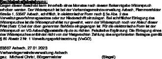 Gegen diesen Bescheid kann innerhalb eines Monates nach dessen Bekanntgabe Widerspruch erhoben werden. Der Widerspruch ist bei der Verbandsgemeindeverwaltung Asbach, Flammersfelder Straße 1, 53567 Asbach, schriftlich, in elektronischer Form nach § 3a Abs. 2 des Verwaltungsverfahrensgesetzes oder zur Niederschrift einzulegen. Bei schriftlicher Einlegung des Widerspruches ist die Widerspruchsfrist nur gewahrt, wenn der Widerspruch noch vor Ablauf dieser Frist (Satz 1) bei der oben genannten Behörde eingegangen ist. Für die elektronische Form ist der Widerspruch an VG-Asbach@poststelle.rlp.de zu richten. Fakultative Ergänzung: Die Einlegung eines des Widerspruches entbindet nicht von der fristgerechten Zahlung des angeforderten Betrages gemäß § 80 Absatz 2 Nr. 1 Verwaltungsgerichtsordnung (VwGO).