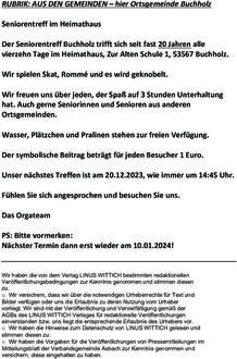 Der Seniorentreff Buchholz trifft sich seit fast 20 Jahren alle vierzehn Tage im Heimathaus, Zur Alten Schule 1, 53567 Buchholz.