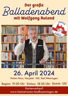 Dass die klassischen Balladen auch lebendig und ausgesprochen kurzweilig sein können, davon wird Wolfgang Ruland das Publikum am Freitag, den 26. April 2024, um 19 Uhr im Hohen Haus überzeugen. Neben Balladen von Goethe und Schiller werden auch Werke von Clemens Brentano, Heinrich Heine, Theodor Fontane und Erich Kästner in unerhörter Weise vorgetragen. Ob übermütiger Zauberlehrling oder rachedurstiger Tyrann: Wolfgang Ruland verleiht den Charakteren mit faszinierender schauspielerischer Darstellung eine eigene Persönlichkeit und lässt sie emotional erfahrbar werden. Da wird geraunt und gestaunt, geflüstert und geflucht, geschmeichelt und geschmachtet, geseufzt und gesungen, gejammert und gejubelt, geschrien und geschnaubt, verzweifelt und vermaledeit! Von laut bis leise, von wild bis mild. Kurz: Balladen, so wie man sie noch nie gehört hat!