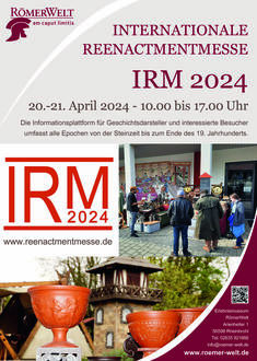 Am 20. und 21. April 2024 findet in der RömerWelt am caput limitis in Rheinbrohl wieder die Internationale Reenactmentmesse IRM statt. An mehr als zwei Dutzend Ständen auf der Freifläche, in den Umgängen und im Veranstaltungsraum des Museums sind vielfältige Replikate, Nachfertigungen und Kopien archäologischer Fundstücke und historischer Gegenstände von der Steinzeit bis zum Ende des 19. Jahrhunderts zu sehen und zum Teil auch zu erwerben. Neben Textilien und Zubehör für Textilarbeiten, vom pflanzengefärbten Garn bis hin zu handgewebten und handgenähten Kleidungsstücken nach historischen Vorlagen, werden vorbildgetreue Tonwaren, Glasperlen und Glasgefäße, Lederwaren und allerlei authentische Kuriositäten auf dem Programm stehen.