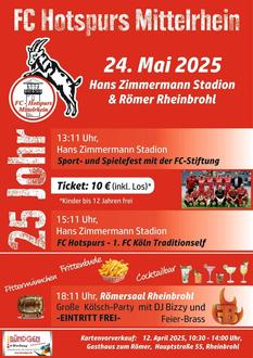 Am 24. Mai 2025 ist es soweit! Der FC Hotspurs Mittelrhein feiert sein 25-jähriges Bestehen mit einem großen Fußball- und Familienfest im Hans-Zimmermann-Stadion sowie einer anschließenden Kölsch-Party im Römersaal Rheinbrohl.