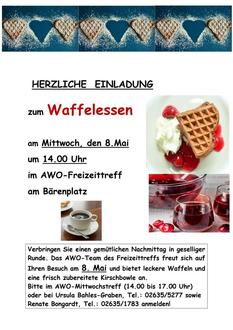 Am Mittwoch, 8. Mai weht wieder ein Duft von frisch gebackenen Waffeln durch den Raum des AWO - Freizeittreffs am Bad Hönninger Bärenplatz (DRK-Heim). Alle Bürgerinnen und Bürger sind ab 14.00 Uhr herzlich eingeladen, in geselliger Runde bei leckeren Waffeln und Getränken nach Wahl einen gemütlichen Nachmittag im frühlingshaft dekorierten AWO - Freizeittreff zu verbringen. Der Erlös der Veranstaltung kommt sozialen Projekten zugute. Um Anmeldung wird gebeten bei Ursula Bahles-Graben, Tel.: 02635/5277 oder Renate Bongardt, Tel.: 02635/1783. Das Team des AWO-Freizeittreffs freut sich wie jeden Mittwochnachmittag auf viele Besucher.