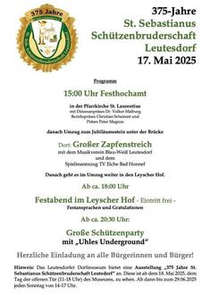 Am Samstag, 17.05.2025, feiert die St. Sebastianus Schützenbruderschaft Leutesdorf ihr 375-jähriges Jubiläum. Dazu lädt sie alle befreundeten Schützenbruderschaften, Gilden und Vereine und alle Bürgerinnen und Bürger aus Leutesdorf herzlich zum Mitfeiern ein.