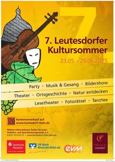 Der 7. Leutesdorfer Kultursommer startet bald mit einem abwechslungsreichen Programm. Die einzelnen Termine, weitere Informationen sowie den Link für den Kartenvorverkauf finden Sie unter www.leutesdorf-rhein.de. Gedruckte Flyer sind in den meisten Leutesdorfer Betrieben sowie im Gemeindezentrum erhältlich. Wer sich seine Karten nicht selbst online buchen kann, kann diese gerne persönlich am 12.05.2025 oder am 02.06.2025 im Gemeindezentrum (Oelbergstraße 12a) jeweils zwischen 18:00 Uhr und 19:00 Uhr kaufen.