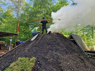 Abschließend wurde der Kamin mit Grassoden und Erde verschlossen und der Prozess der Umwandlung von Holz in Holzkohle konnte beginnen. Wenn alles wie erhofft verläuft, wird der Meiler an Pfingstsonntag geöffnet und die Holzkohle geerntet. Bis dahin versorgen und bewachen die Köhler und Köhlerinnen den Meiler rund um die Uhr im 3-Schichtensystem.