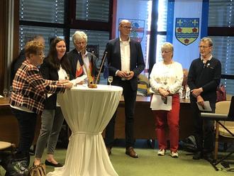 Nach einem kurzen Intermezzo mit vom Chor “Vokalensemble“ vorgetragenen Musikstücken ergriff die Vertreterin von Bürgermeister Landais aus Saint-Pierre-lès-Nemours (Monique Breysach) das Wort und überbrachte Grüße und Glückwünsche der Stadt Saint-Pierre-lès-Nemours. Hier schloss die Rede des Président du Jumelage (Jean Turpin) an bevor nach weiteren Liedvorträgen des Chors (unter anderem mit dem “Ohrwurm“ Aux Champs Élysée) die Vorsitzende des Freundeskreis Bad Hönningen - Saint-Pierre-lès-Nemours das Wort ergriff und in ihrer unkonventionellen Art allen Beteiligten ihren Dank aussprach und darauf hinwies, dass man bei dem folgenden Mittagessen auf ein Dessert verzichtet habe, um nach dem Buffet mit - typisch deutsch - Kaffee und Kuchen in den Nachmittag hinüberzugleiten.