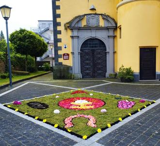 An Fronleichnam wurden Blumenteppiche von der Katholischen Frauengemeinschaft (kfd) und der Kolpingsfamilie Bad Hönningen gemeinsam vor der Kirche und im Rosengarten gelegt.