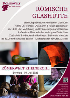 Zur Einstimmung in die Thematik hält der Geschäftsführer der RömerWelt und Experte der römischen Glasverarbeitung, Frank Wiesenberg um 12.00 Uhr einen Vortrag "Aus Lehm & Feuer geschaffen - Die Römische Glashütte in der RömerWelt."