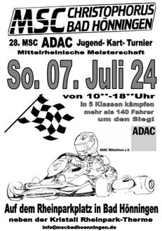 Am Sonntag, den 07. Juli ist es wieder soweit. Im Rahmen des ADAC Mittelrhein findet das 28. Jugend-Kart-Slalom Turnier des Motorsportclub Bad Hönningen statt. Auf dem Großraumparkplatz der Rhein-Park-Therme starten ab 10:00 Uhr ca. 100 Fahrerinnen/Fahrer in deren Alterklassen um den Sieg. Bei, hoffentlich sonnigen Temperaturen, freuen wir uns auf euren Besuch!