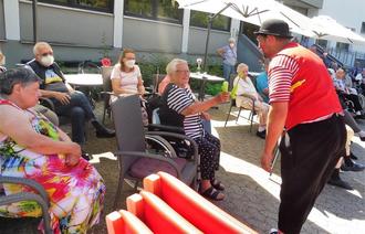 Der Freundeskreis des Seniorenheims „Rheinwaldheim“ hatte mal wieder für ein großartiges Programm zu Gunsten der Seniorinnen und Senioren gesorgt. Der Familiencircus „Carissima“, der das Altenheim schon einmal besucht hatte, freute sich endlich wieder gute Laune zu verbreiten. Das Wetter spielte mit, sodass die Bewohnerinnen und Bewohner des Rheinwaldheims, die akrobatischen und artistischen Darbietungen der Künstler begeistert auf dem Außengelände verfolgen konnten. Neben den Eltern, erfreuten auch die beiden Kinder und der liebenswerte Hund Rocco, mit ihren Einlagen ihr Publikum. Auf dem Programm standen die Zauberei, ein Tanz auf dem Seil, Akrobatik mit Reifen und vieles mehr. Und natürlich durfte dabei der Clown nicht fehlen, der dem „älteren“ Semester quasi auf die „Pelle“ rückte. Es waren viele atemberaubende Momente die den Bewohnern geboten wurden. Im Anschluss an die Zirkusrevue bekam jeder im Publikum sein Lieblingstier, gebastelt aus einem Luftballon, geschenkt. „Es war ein sehr schöner Nachmittag für die Bewohnerinnen und Bewohner, der an das Leben vor Corona erinnerte,“ so der Vorsitzende Dr. Jürgen Rabe.