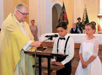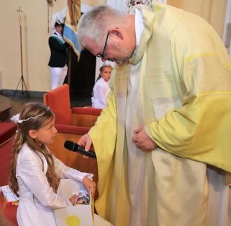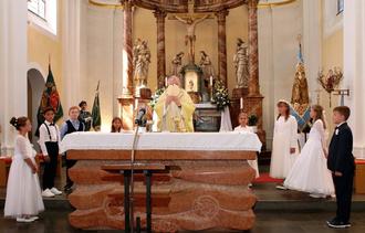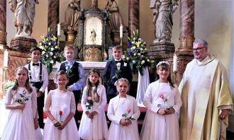 Kommunionskinder der 1. Hl. Kommunion mit Pastor Christian Scheinost