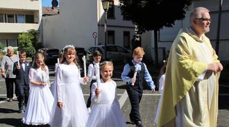 Auch in diesem Jahr, rief die katholische Kirche auf, das Fest der Erstkommunion zu feiern. Die Hürden der Pandemie zwar etwas gelockert, aber immer noch nicht wirklich befreit. So finden in der Verbandsgemeinde Bad Hönningen, insgesamt sechs Kommunionsfeiern statt, damit auch wirklich alle Vorschriften eingehalten werden können. Erwartungsvoll trafen sich am Sonntag die Kommunionkinder zur ersten Feier in Bad Hönningen vor dem Festgottesdienst im Pfarramt, um von dort gemeinsam mit dem Pastor Christian Scheinost und den Fahnenabordnungen der Junggesellen aus Bad Hönningen und Leubsdorf, der Schützenabordnung St. Sebastianus, unter feierlichem Glockenklang in die Pfarrkirche St. Peter und Paul, würdevoll einzuziehen. Die Kinder hatten sich in den vergangenen Wochen, mit Unterstützung der Eltern auf diesen großen Tag vorbereitet. Hierfür sprach der Geistliche den Eltern seinen besonderen Dank aus, da die Beteiligung der Eltern ein sehr wichtiges Puzzlestück im Kommunionsunterricht sei, ohne den es nicht gelingen könne, die Kinder auf ihren großen Tag vorzubereiten. Im feierlichen Gottesdienst stand die erste Begegnung der Kinder mit Jesus in dem Zeichen von Brot und Wein im Mittelpunkt. Dieser erste Kommunionempfang war für die Kinder dann auch ein besonders intensives Erlebnis, bei dem die Erwachsenen sich hinsetzten und sich ganz still verhielten, so dass dieser außergewöhnliche Moment noch einmal mehr unterstrichen wurde. Nach dem feierlichen Gottesdienst freuten sich die Kinder auf die restlichen Geschenke, die sie nach dem „Schatz“ der ersten Kommunion, noch zu erwarten hatten ...