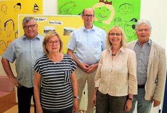 (v.li) Der Kreisbeigeordnete Michael Mahlert, Angelika Breitscheid die damals mit als erste im Kindergartenzweckverband gearbeitet hat, Bürgermeister Jan Ermtraud und Stadtbürgermeister Reiner W. Schmitz gratulierten der Leiterin (2.v. re) Wilma Heinz- Reuter recht herzlich