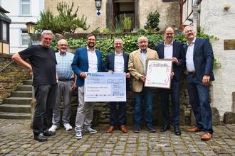 Matthias Herfurth (Vorstand) und Sebastian Jacke von der VR Bank Rhein-Ahr-Eifel sowie Thorsten Hornung und Dirk Saal von der Sparkasse Neuwied informierten sich vor Ort über den Sanierungsbedarf im „Hohen Haus“ in Bad Hönningen. Sie wurden vor Ort von Vorstandsmitgliedern des Heimatvereins begrüßt. Professor Thomas Kesseler und Vorsitzender Guido Job führten die Besucher durch das älteste ehemalige Wohnhaus Bad Hönningens. Dabei wurde der Sanierungsbedarf an Fenstern, Kloben, Fensterläden und Putz in Augenschein genommen. Allen ist klar: In dem Denkmal aus dem 15. Jahrhundert muss zeitnah Einiges geschehen, das geht jedoch nur mit Hilfe von Sponsoring und Spenden. Die beiden Banken aus der Region haben bereits jeweils mehr als nur einen „Fensterbaustein“ gespendet, wofür der Heimatverein sehr dankbar ist, und weitere Unterstützung wurde in Aussicht gestellt.